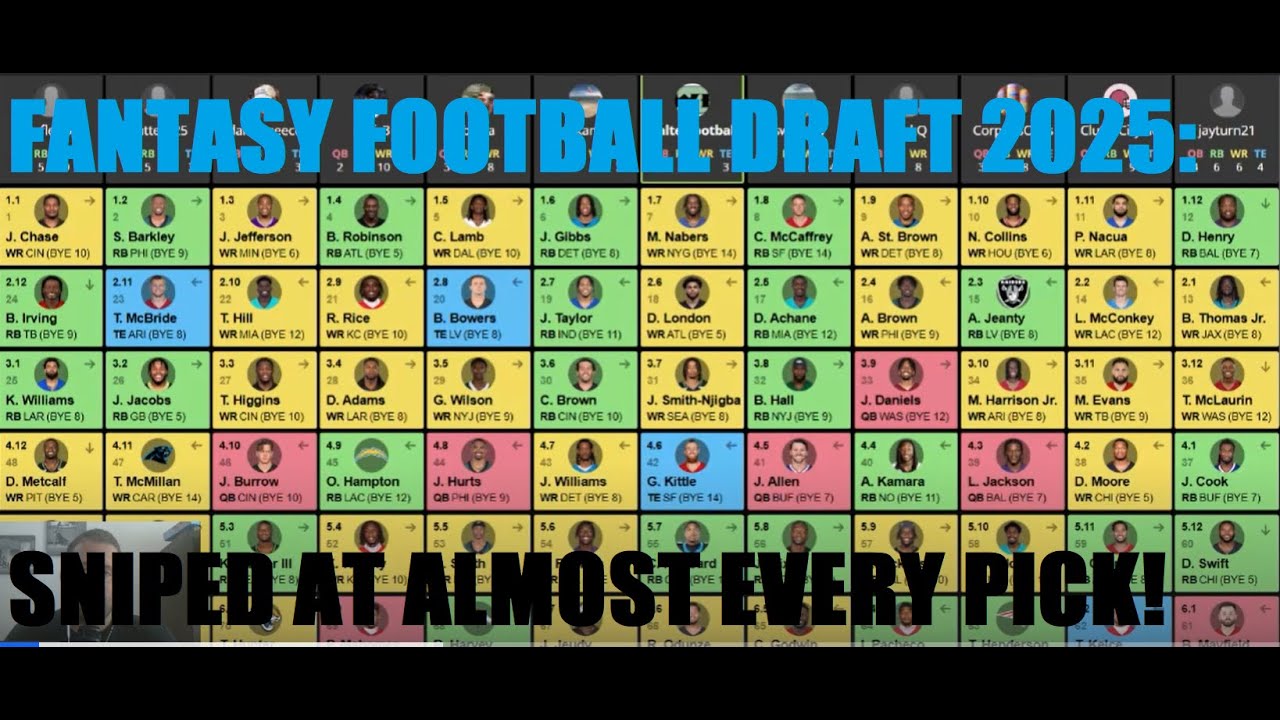 . A vlog by the YouTube channel named in the video’s upper left corner and serves as the original blog post for this content.Reviewing a fantasy football draft for the 2025 NFL season where I was sniped at almost every pick. I also discuss some terrible …