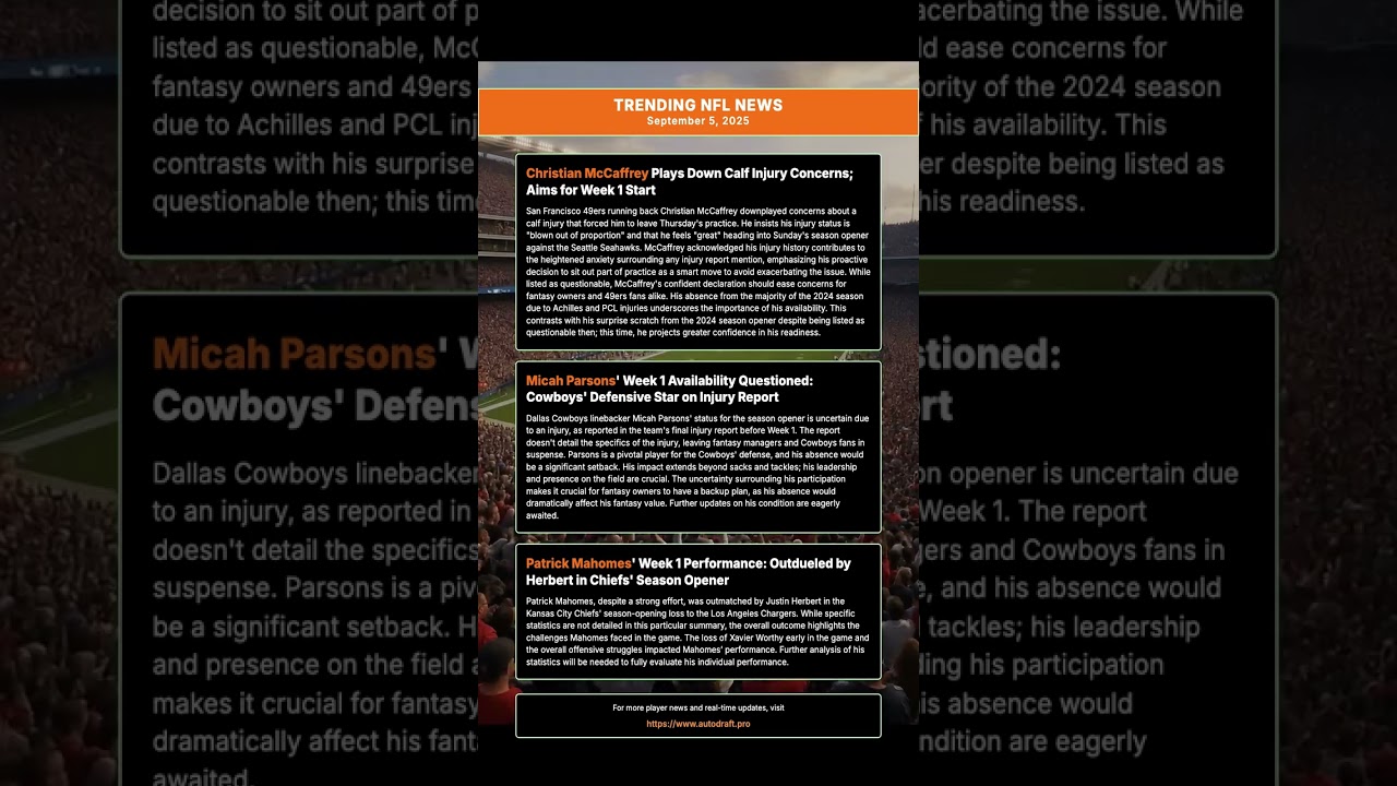 . A vlog by the YouTube channel named in the video’s upper left corner and serves as the original blog post for this content.Trending NFL News for September 5, 2025 Christian McCaffrey: Christian McCaffrey Plays Down Calf Injury Concerns; Aims for …