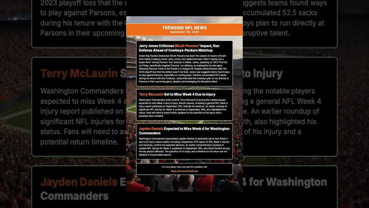 . A vlog by the YouTube channel named in the video’s upper left corner and serves as the original blog post for this content.Trending NFL News for September 26, 2025 Micah Parsons: Jerry Jones Criticizes Micah Parsons’ Impact, Run Defense …